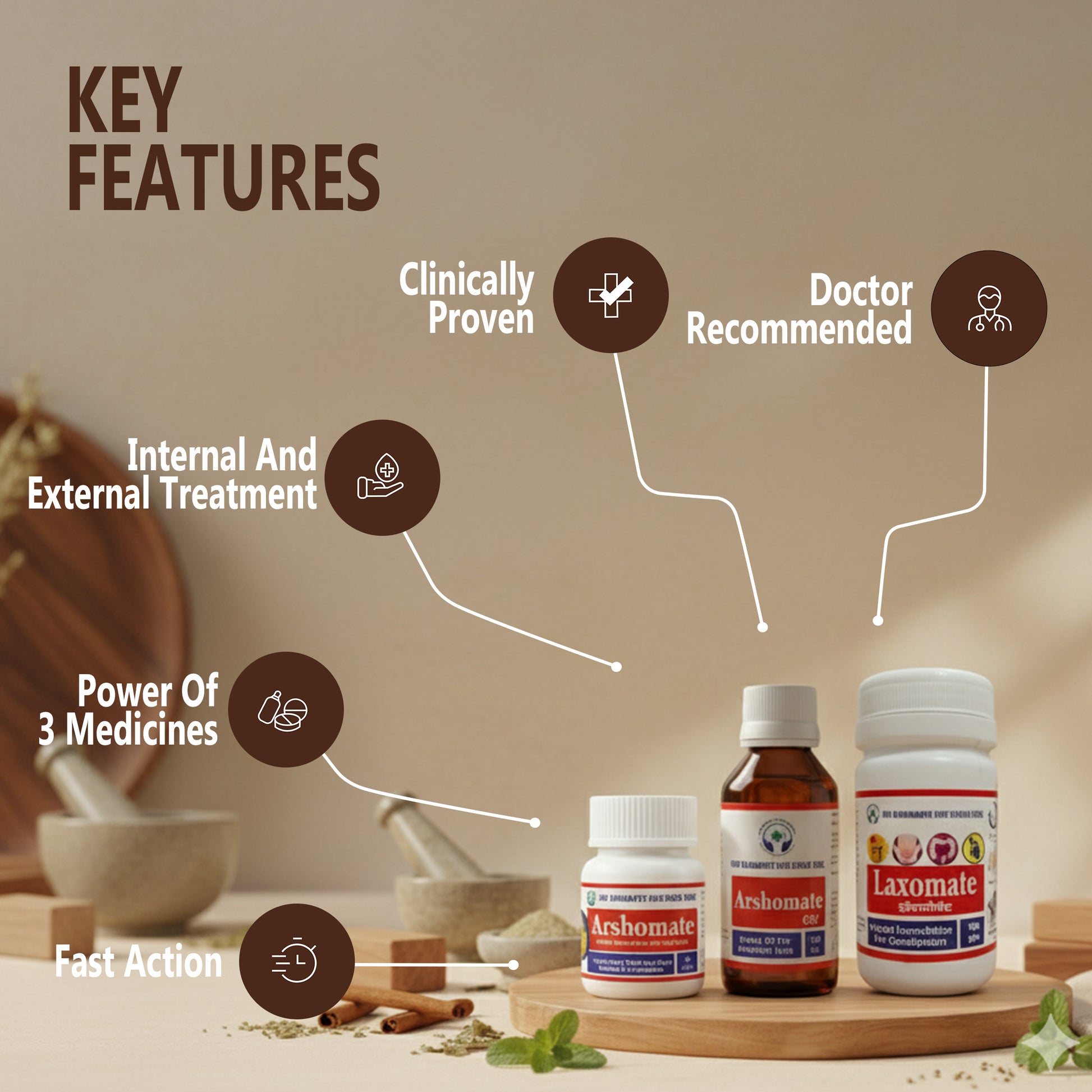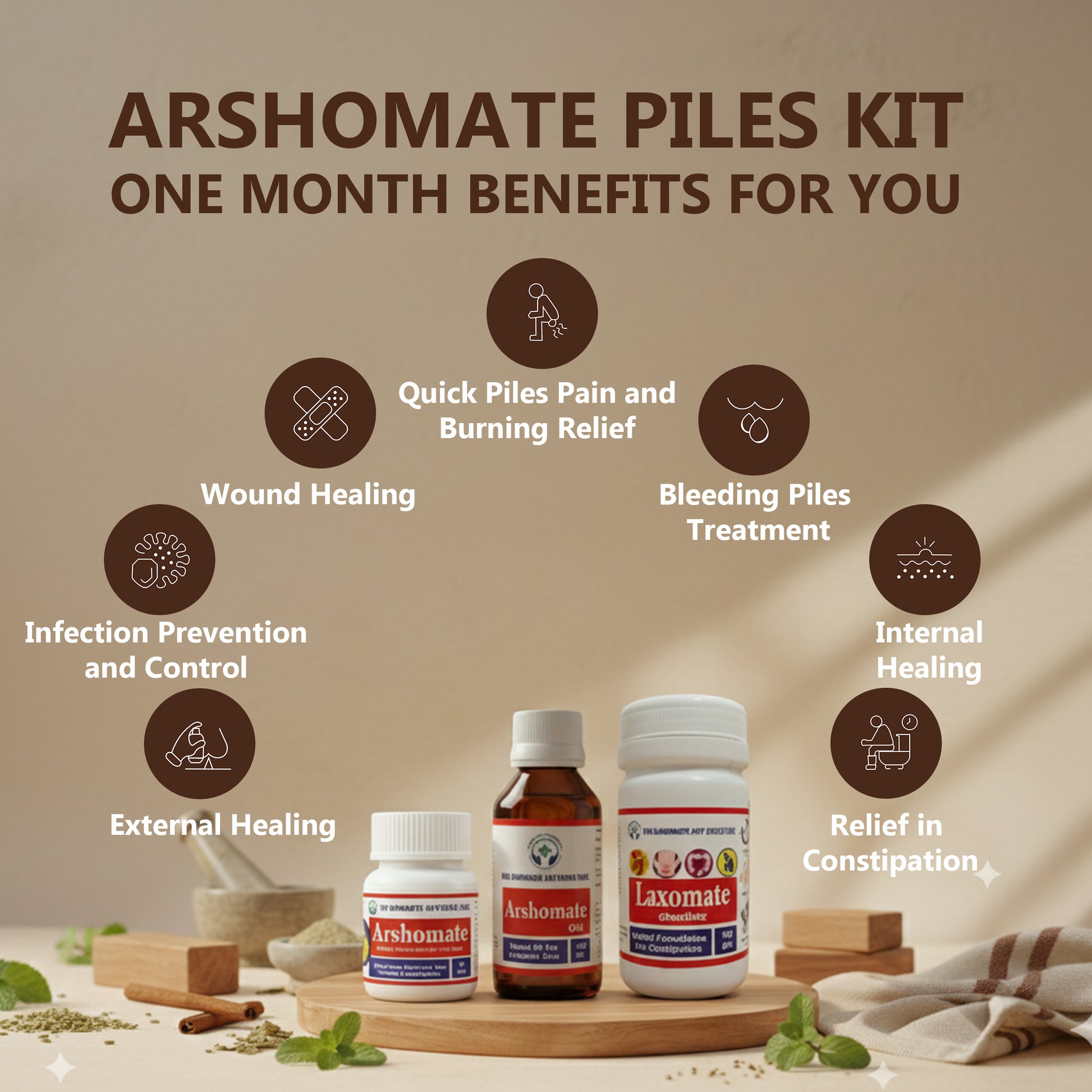Kit Contains: Arshomate Tablet x 2 units, Laxomate Churn x 2 units, and Arshomate Oil x 1 unit